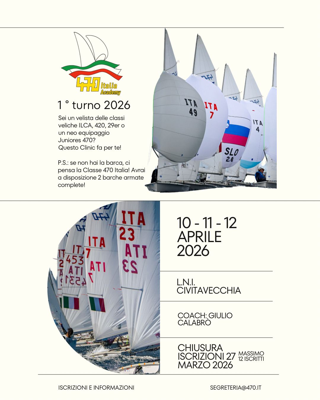 Il primo turno della 470 Academy si terrà dal 10 al 12 aprile presso la Lega Navale Italiana – Sezione di Civitavecchia, con Giulio Calabrò come coach. Gli iscritti che intendono partecipare con la propria barca potranno portarla al circolo già dalla settimana precedente l’inizio dell’evento.